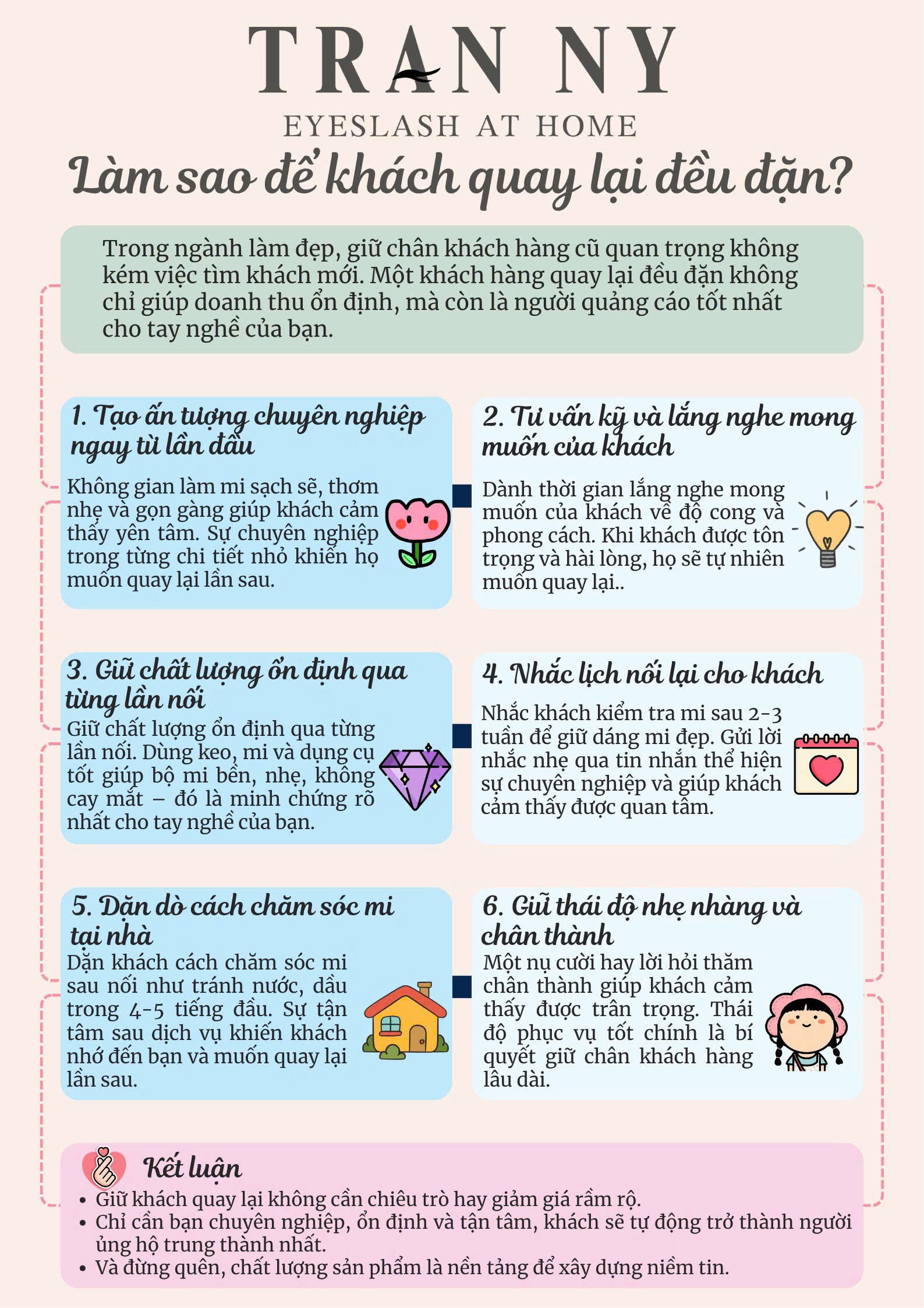 Giữ khách không chỉ nằm ở tay nghề, mà còn ở cách mình quan tâm họ sau mỗi lần nối. Khách có thể đến vì tay nghề, nhưng họ ở lại vì cảm giác được chăm sóc và tin tưởng. Dưới đây là vài bí quyết nhỏ giúp bạn vừa giữ chân khách cũ, vừa khiến khách mới muốn quay lại hoài