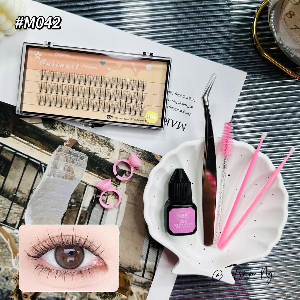 - Combo bao gồm: mi giả, keo nối mi không cay, nhíp nối mi, que đẩy mí, chổi chải mi, nhẫn đựng keo