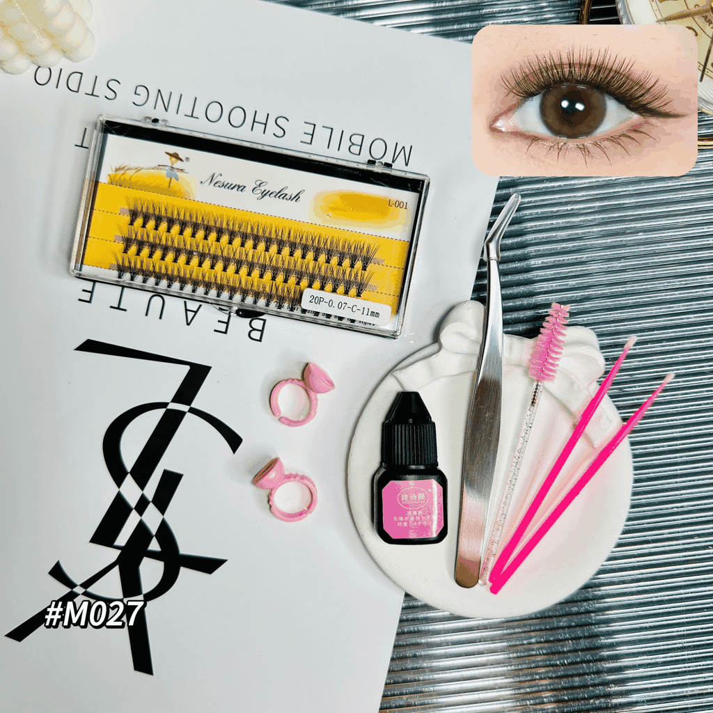 - Combo bao gồm: mi giả, keo nối mi không cay, nhíp nối mi, que đẩy mí, chổi chải mi, nhẫn đựng keo