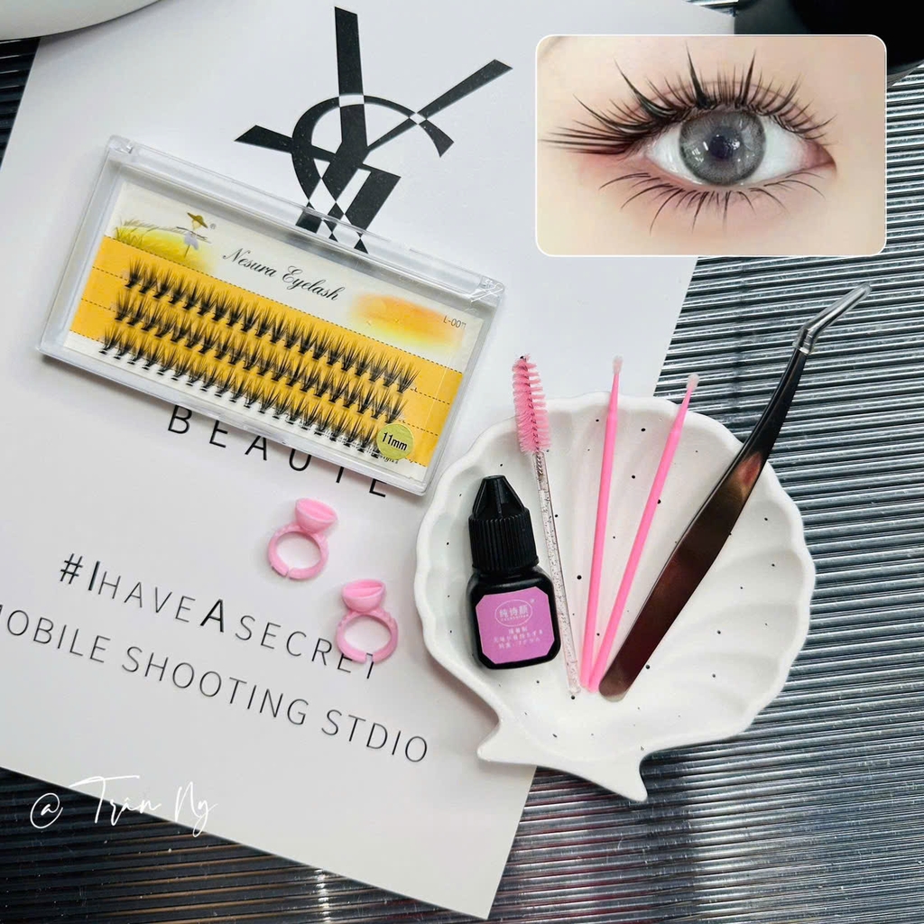 - Combo bao gồm: mi giả, keo nối mi không cay, nhíp nối mi, que đẩy mí, chổi chải mi, nhẫn đựng keo