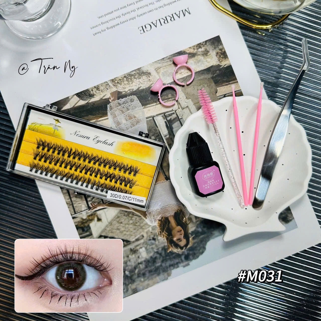 - Combo bao gồm: mi giả, keo nối mi không cay, nhíp nối mi, que đẩy mí, chổi chải mi, nhẫn đựng keo