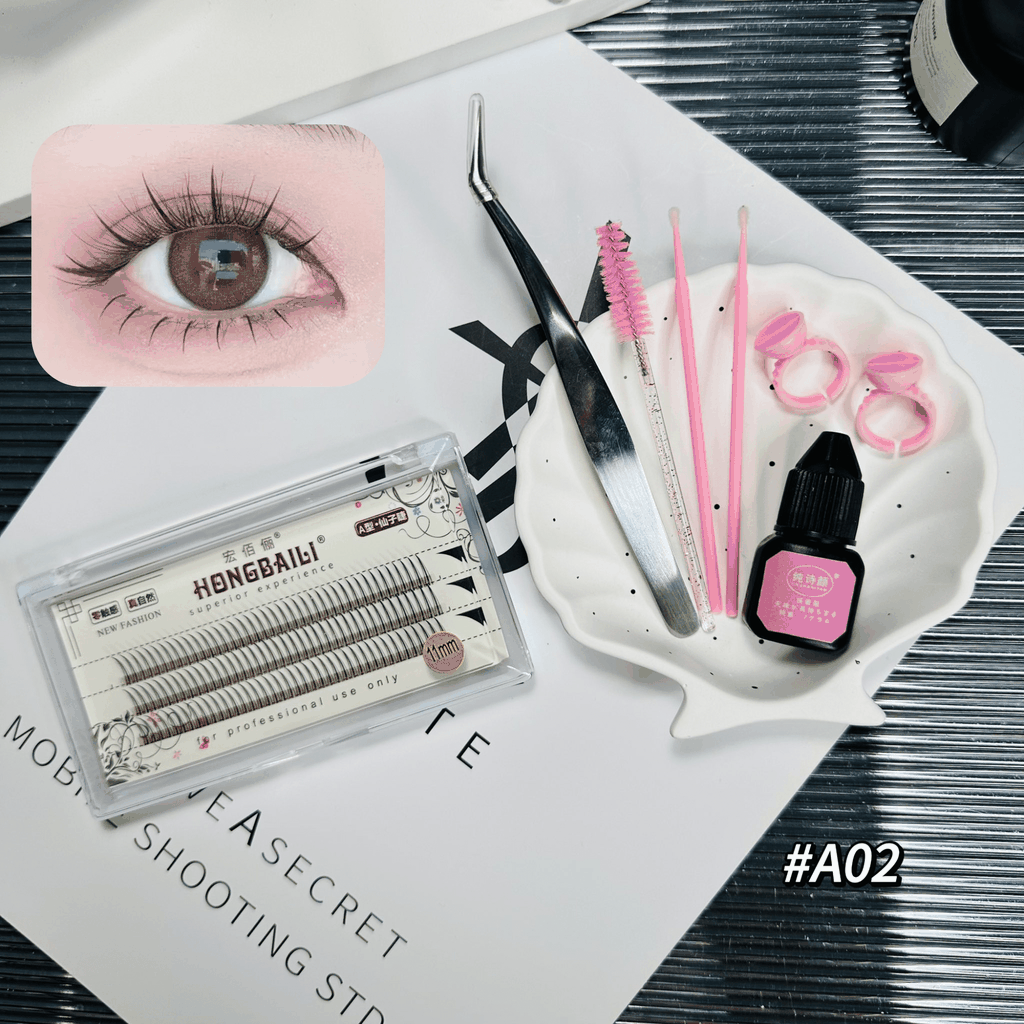 - Combo bao gồm: mi giả, keo nối mi không cay, nhíp nối mi, que đẩy mí, chổi chải mi, nhẫn đựng keo
