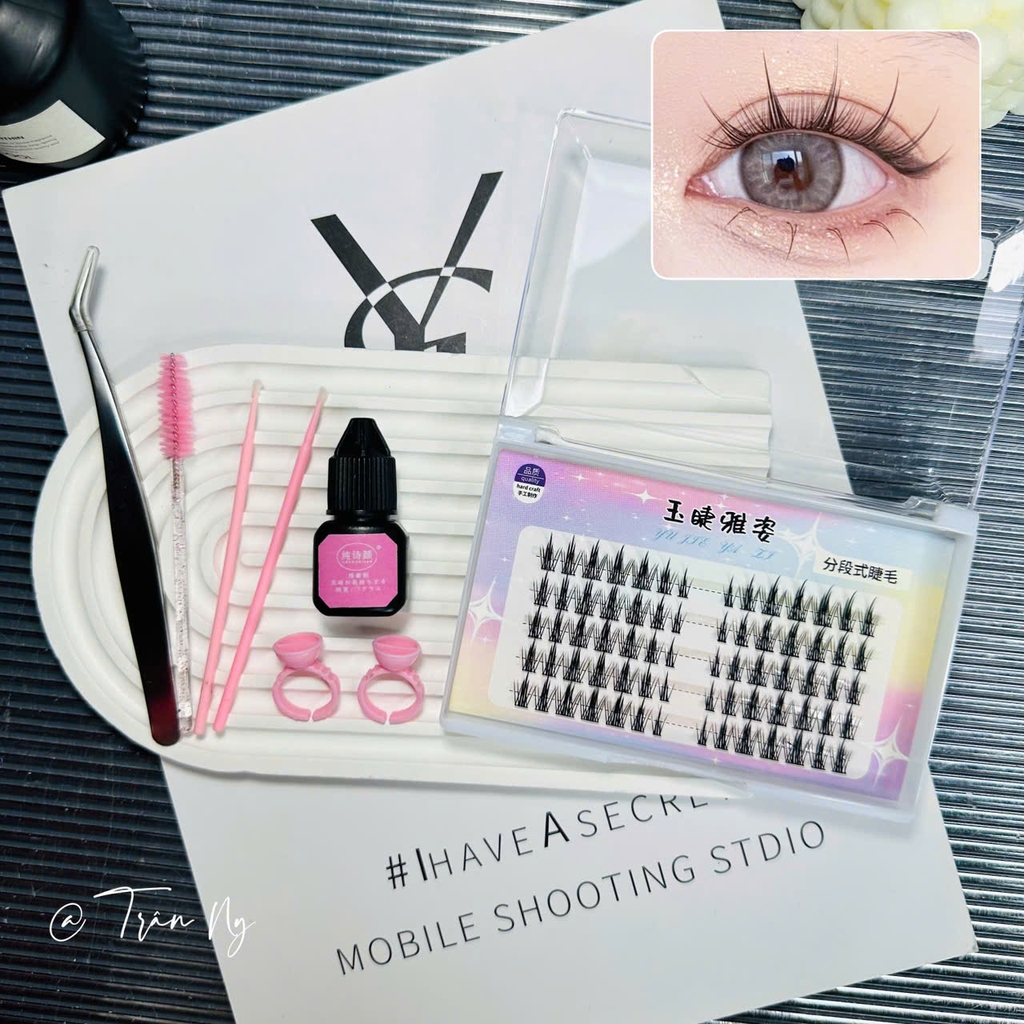 - Combo bao gồm: mi giả, keo nối mi không cay, nhíp nối mi, que đẩy mí, chổi chải mi, nhẫn đựng keo