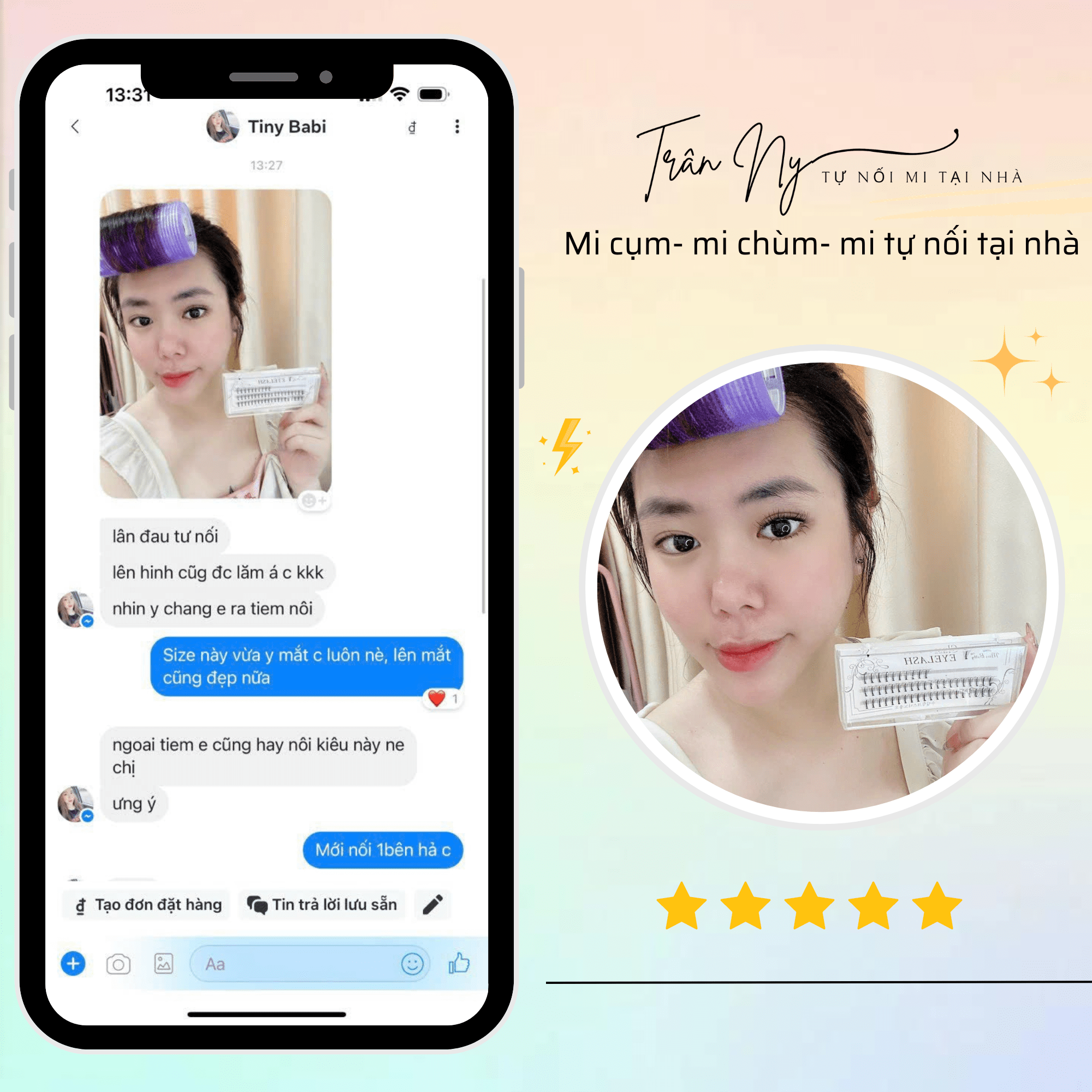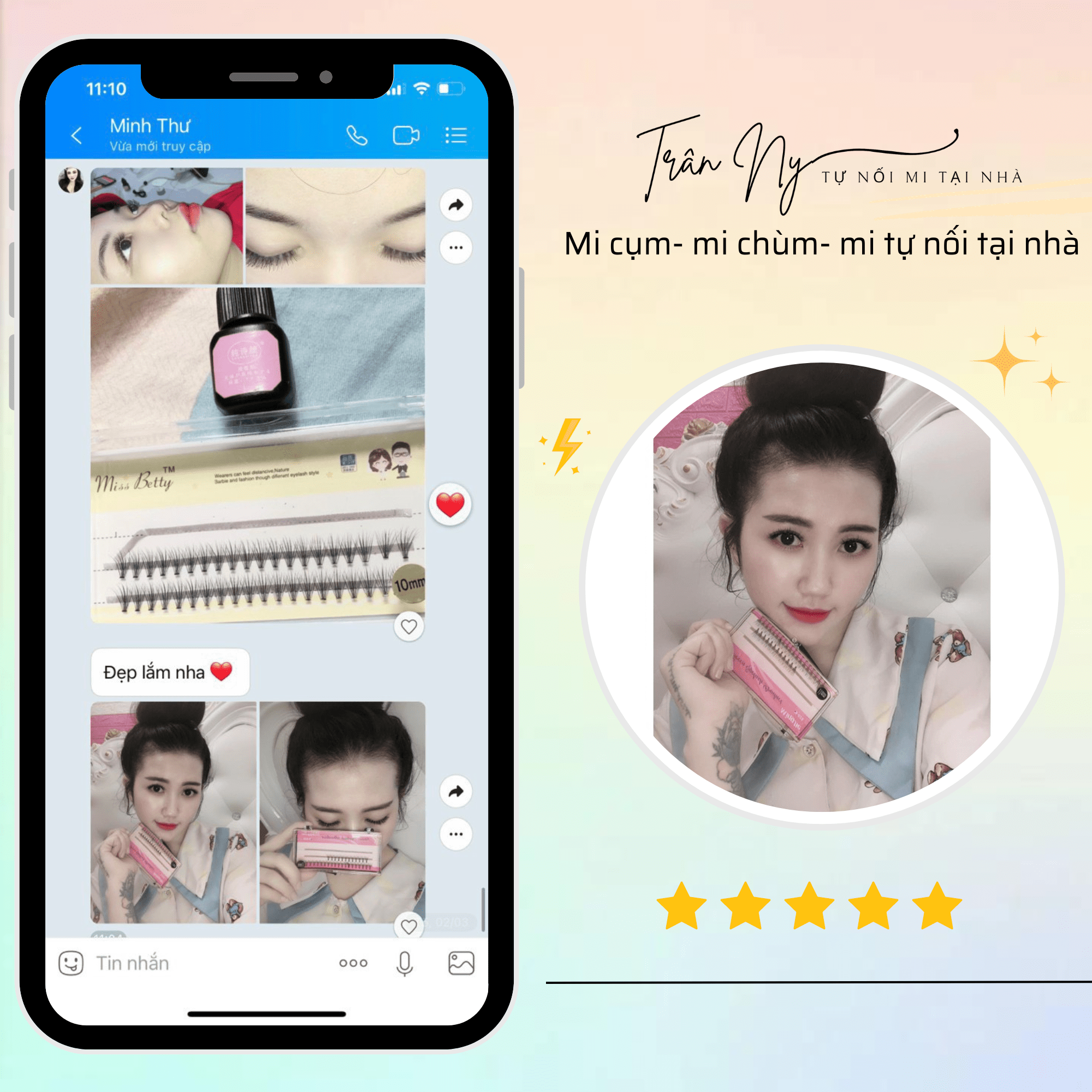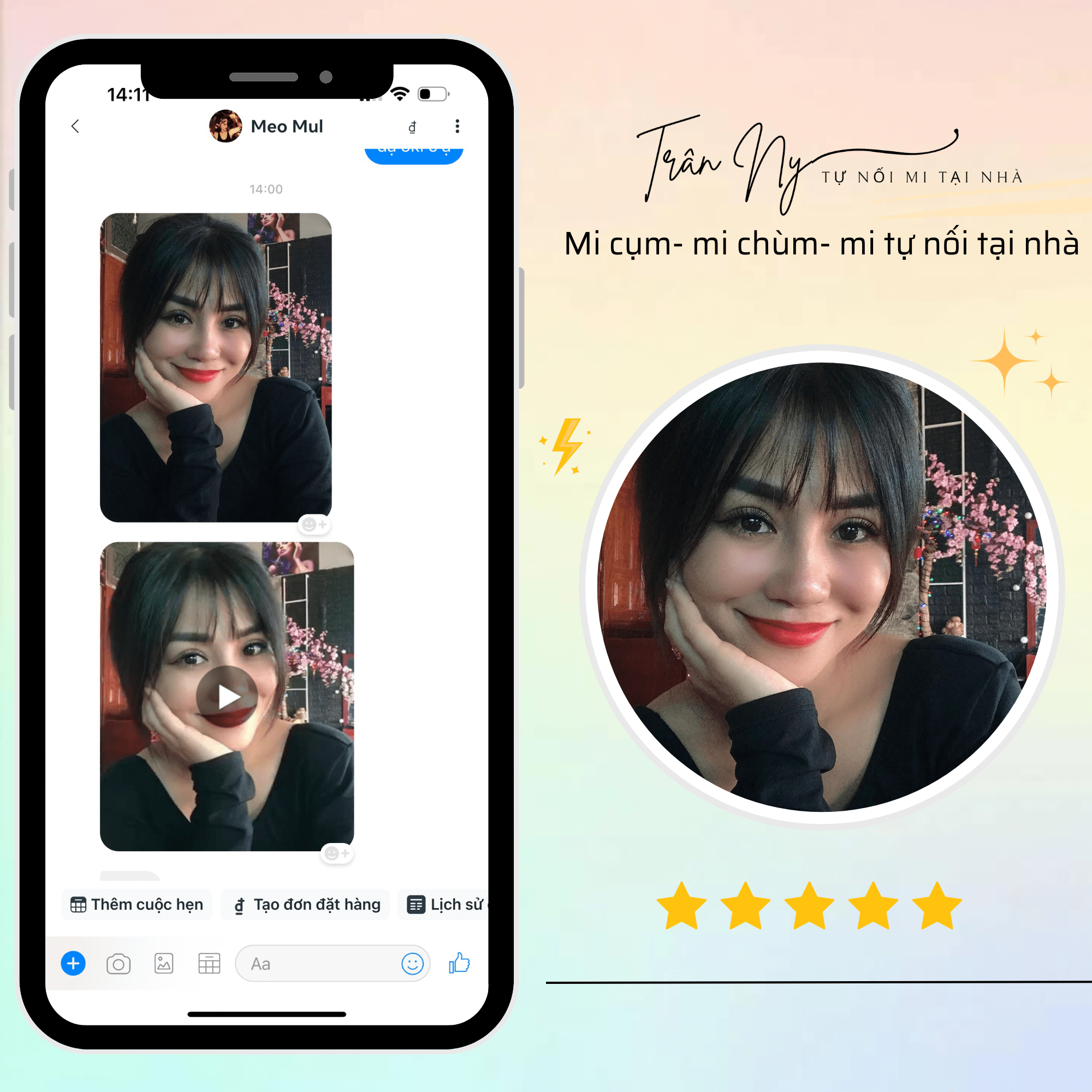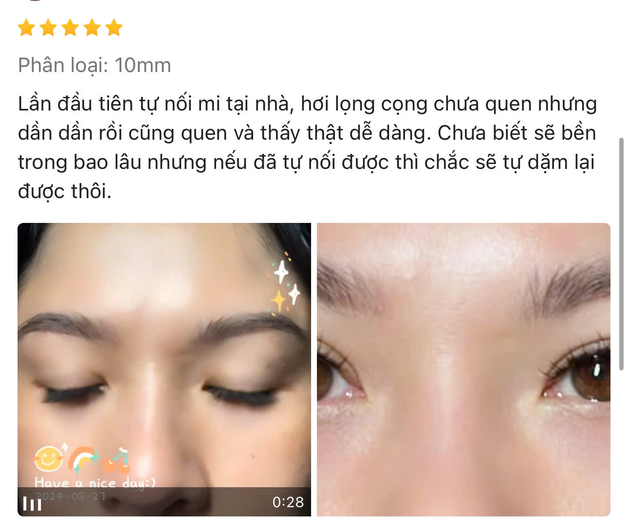 Ảnh & video feedback của khách hàng sử dụng mi tự nối tại nhà. Thể hiện độ dễ dùng, tự nhiên và bền của mi– phù hợp với người mới.