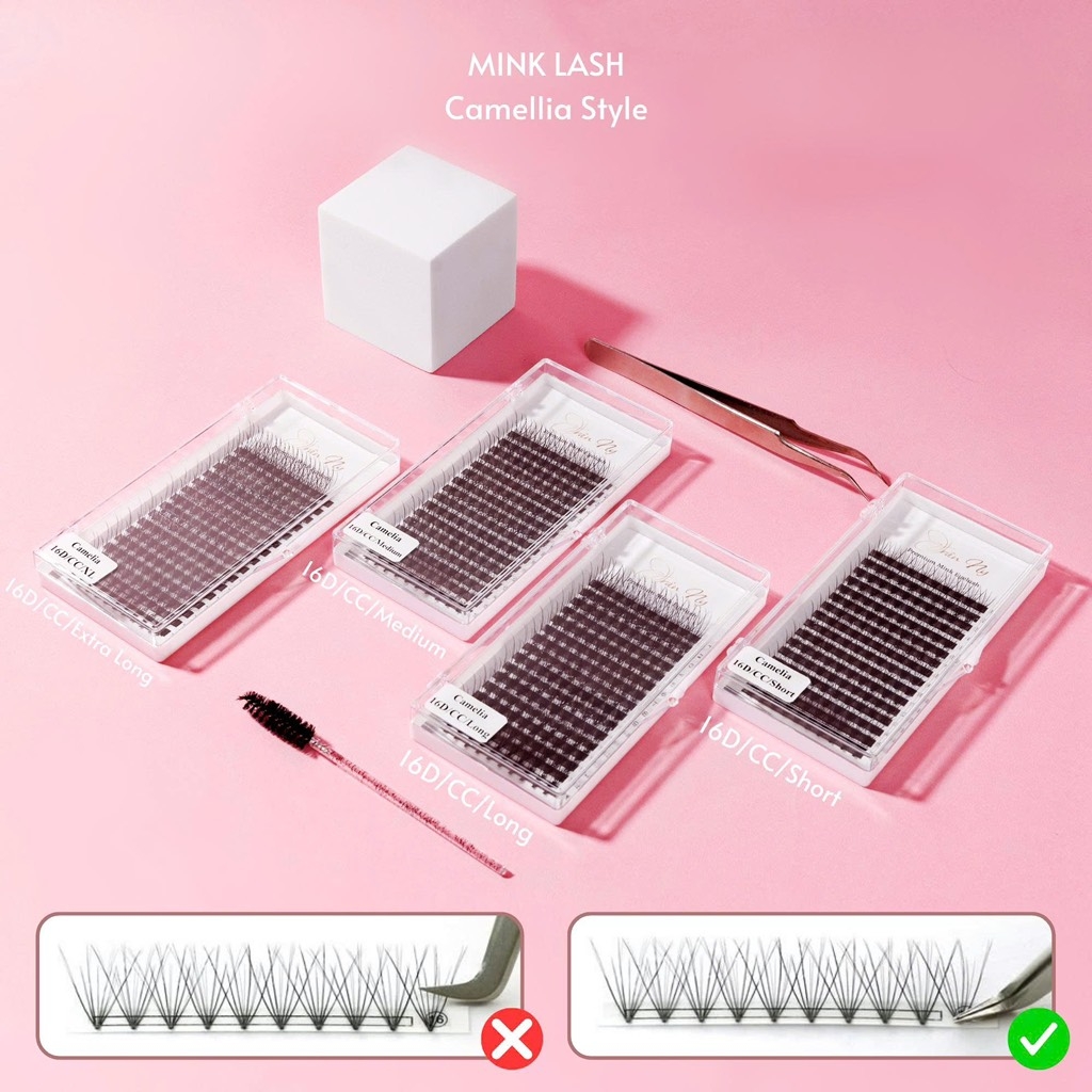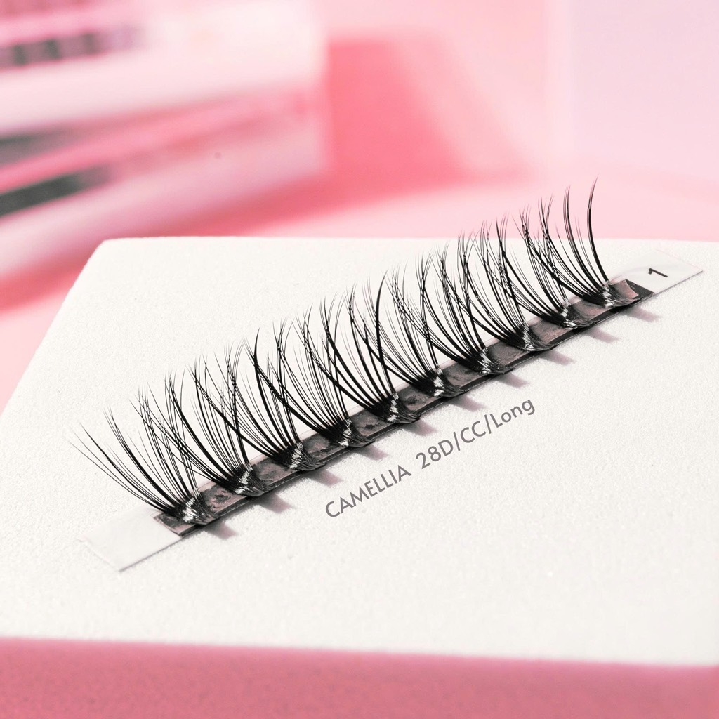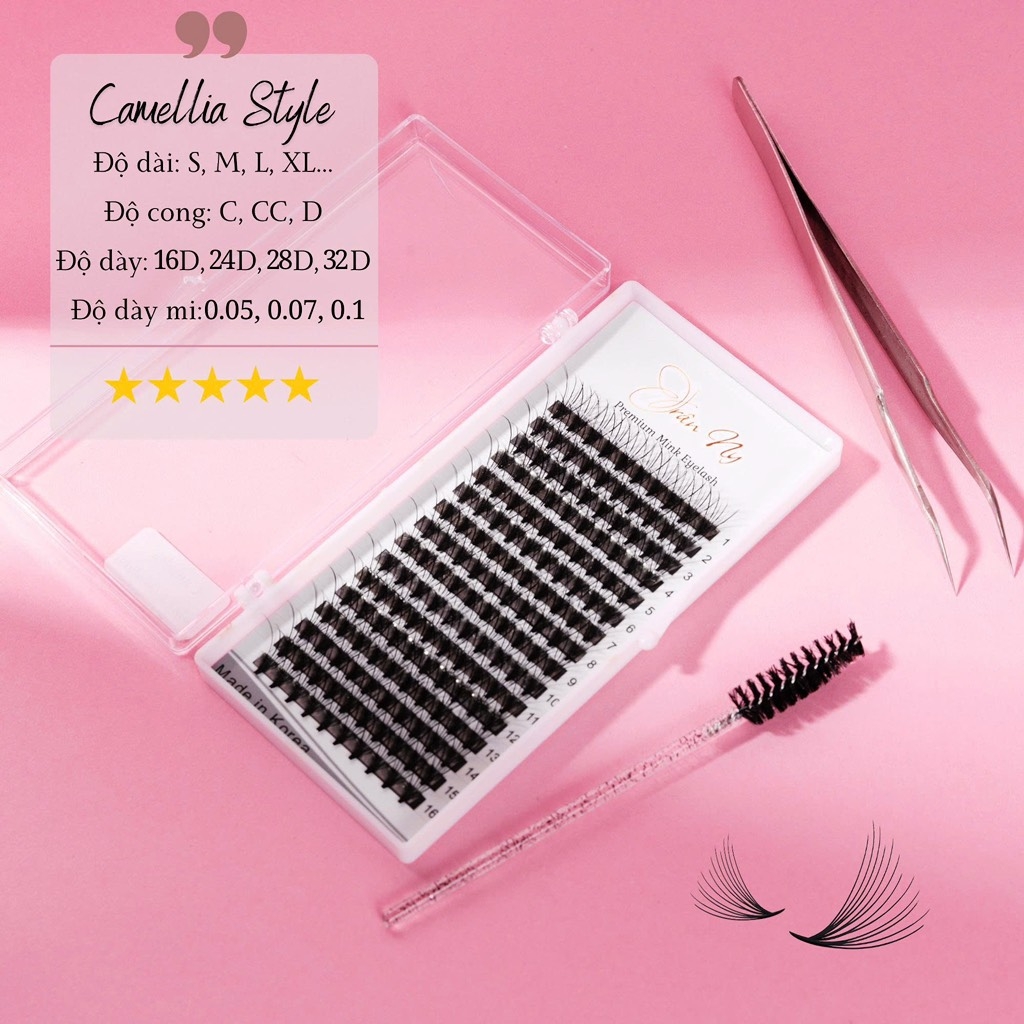 Mi chùm Camellia là dòng lông mi chùm thiết kế dạng fan nhiều sợi, sợi giữa dài hơn hai đầu giúp tạo hiệu ứng xòe nhẹ tự nhiên. Chất mi mềm, nhẹ mắt, bám keo tốt và giữ form ổn định, hỗ trợ thợ nối mi căn dáng nhanh, lên set đều và sắc nét.